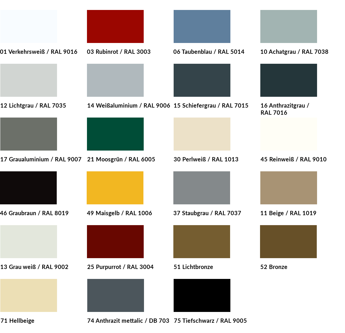 Für die Unterschiene sowie die seitliche Schienenführung können Sie eine Farbe aus den Reflexa Wohnfühlfarben ohne Mehrpreis wählen. Sollte Ihnen diese Auswahl allerdings nicht genügen, erhalten Sie jede andere Farbe als Option. Ihre Aluminium-Profile erhalten Sie in 16 verschiedenen Designs.